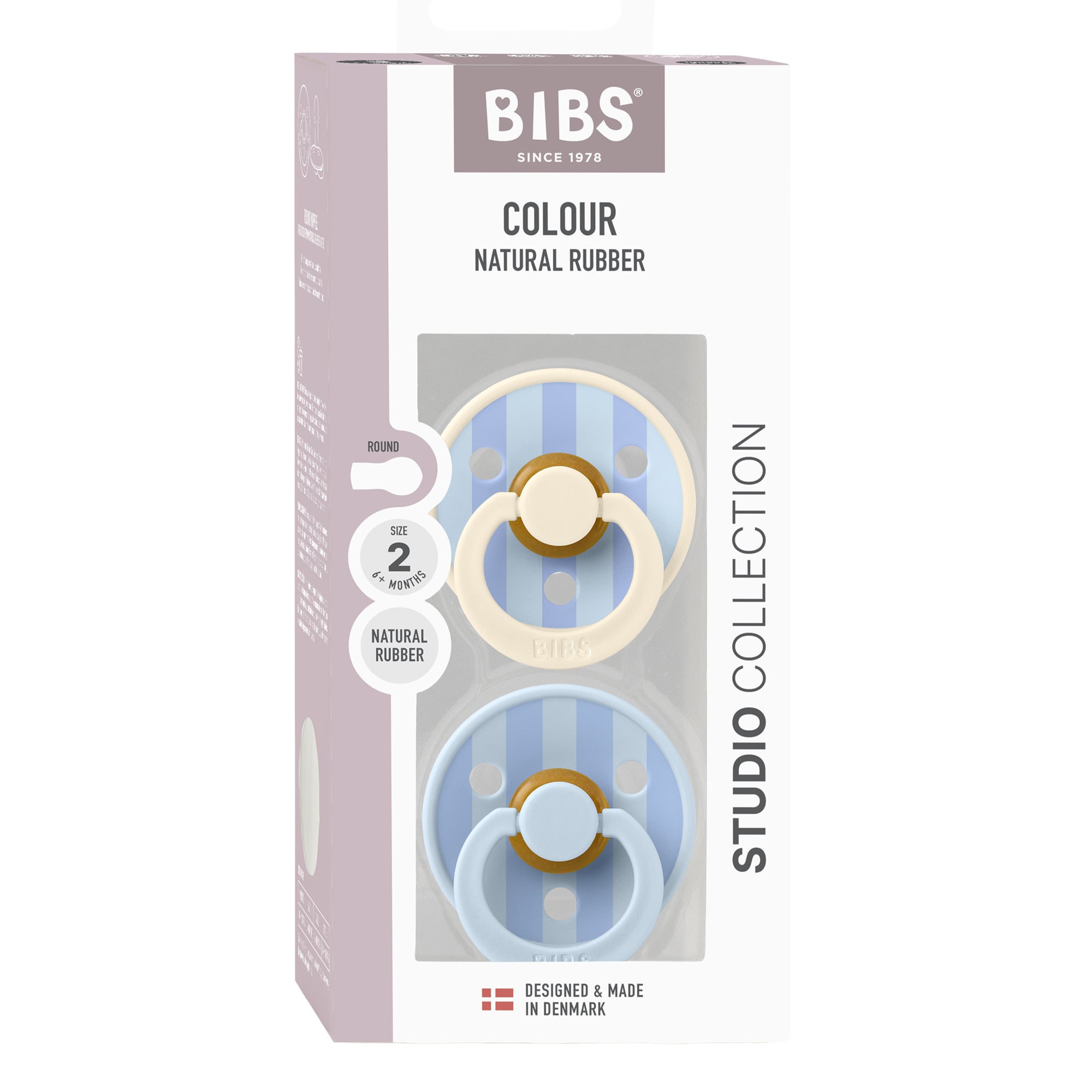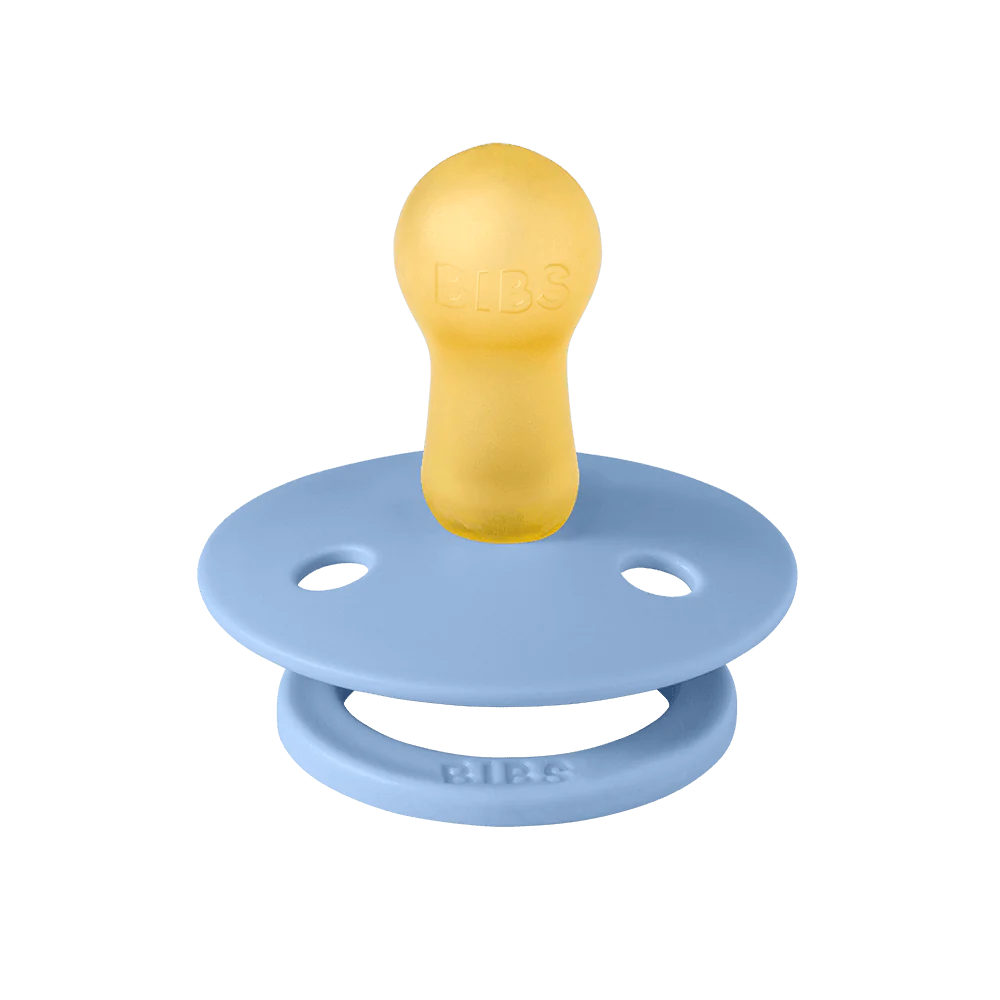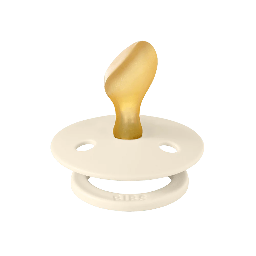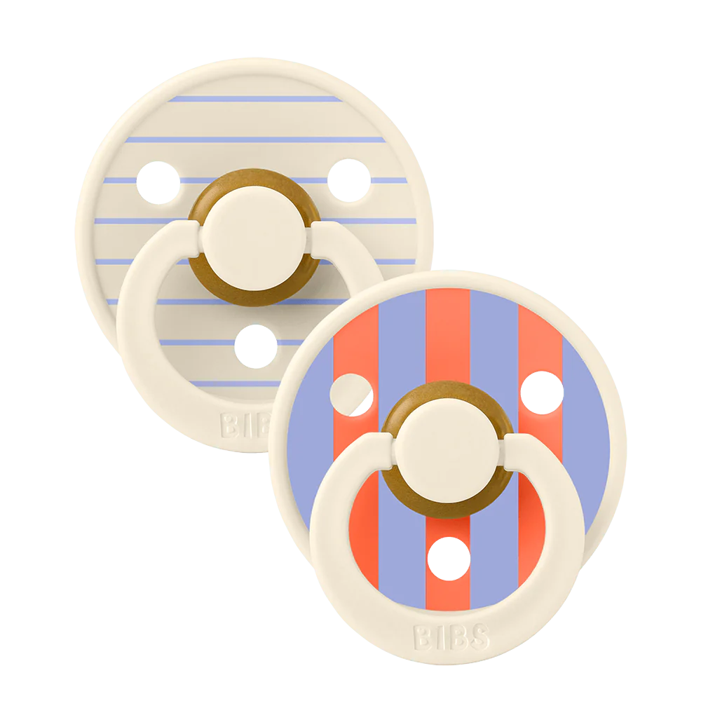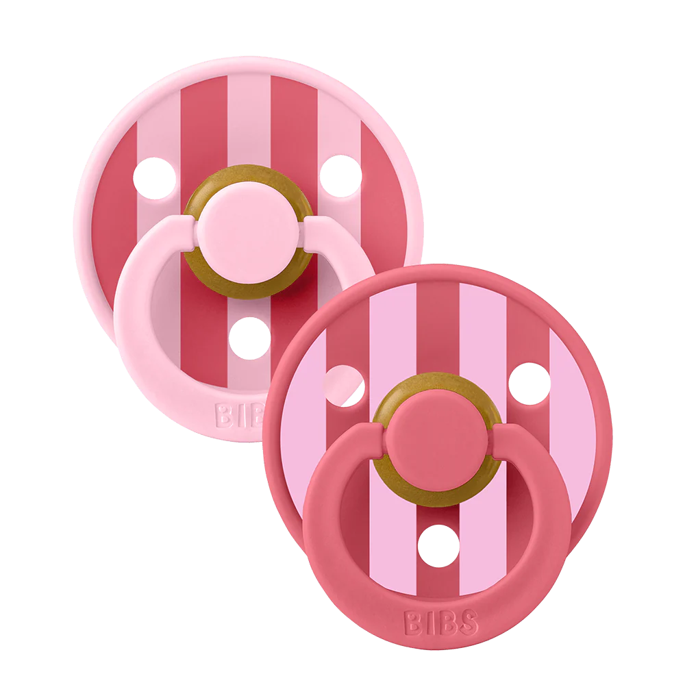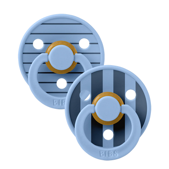 Soothe naturally! The BIBS Round Pacifier Studio Colour 2 Pack features soft natural latex cherry-shaped nipples that mimic breastfeeding. BIBS designed these lightweight pacifiers with a shield for vital airflow. This BIBS set provides comfort for newborns and infants. A thoughtful gift for new parents.