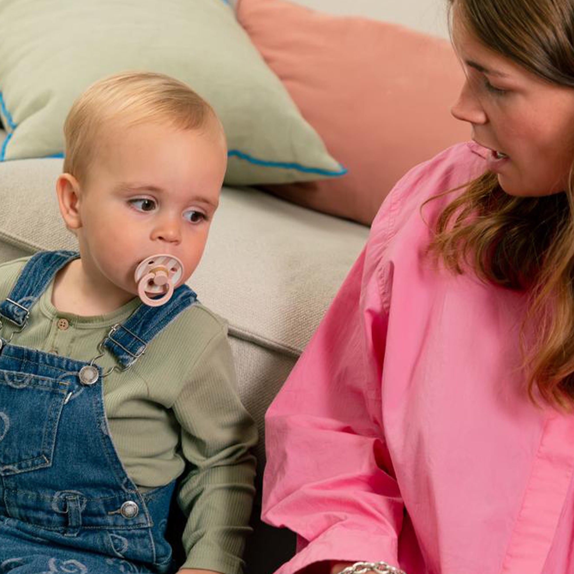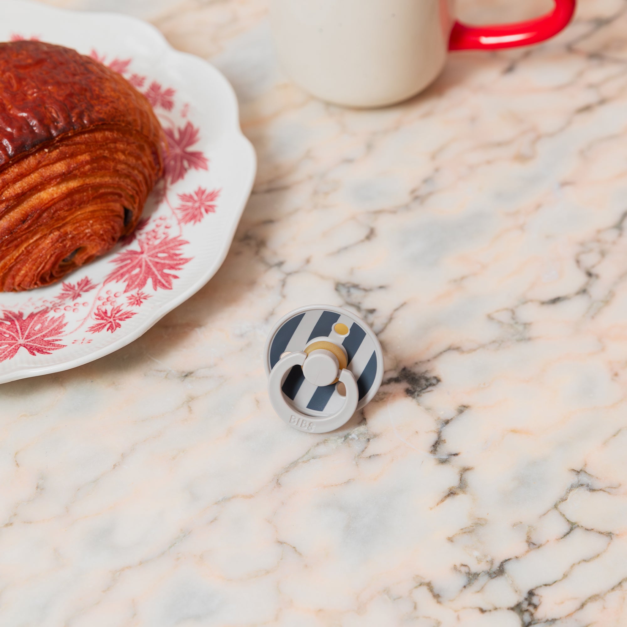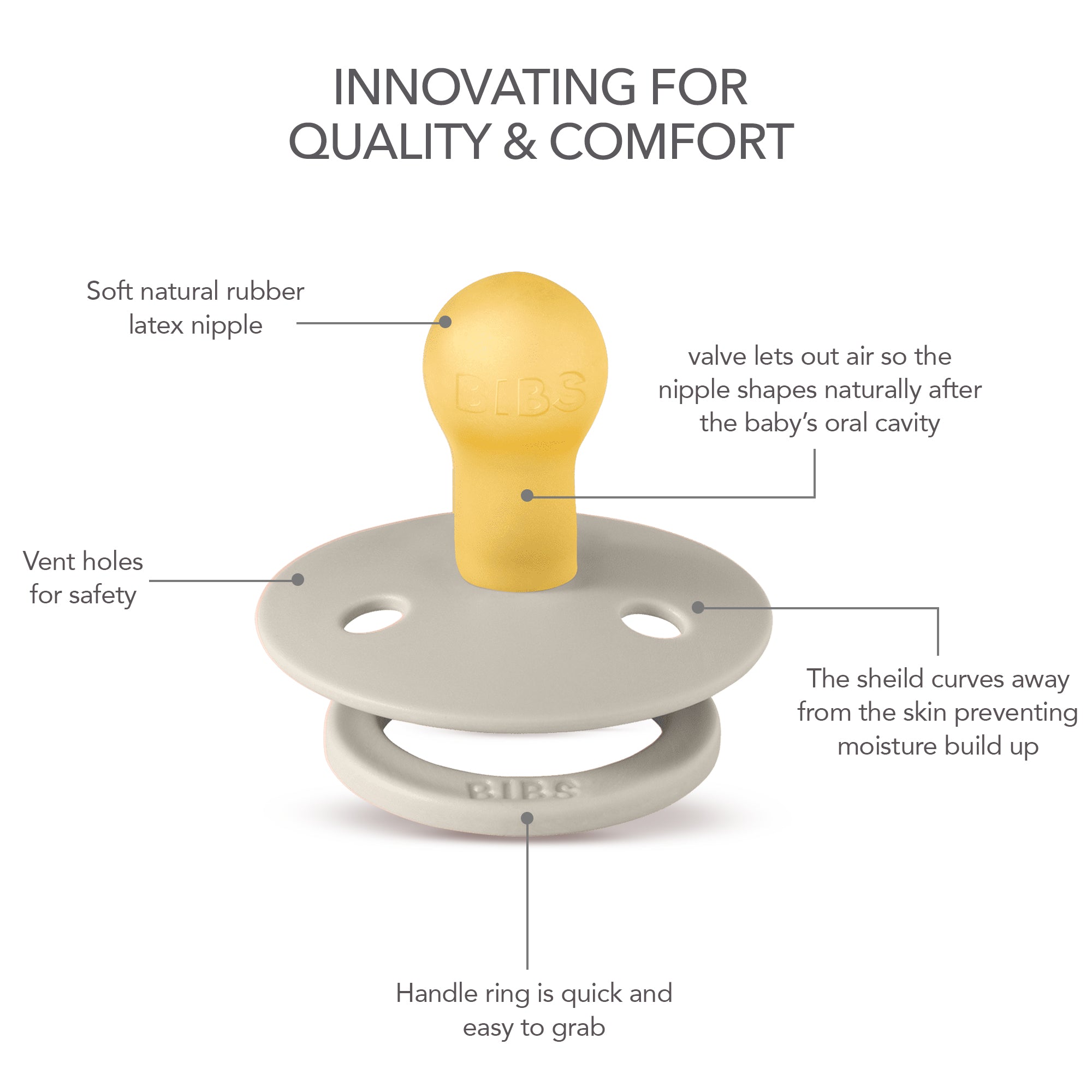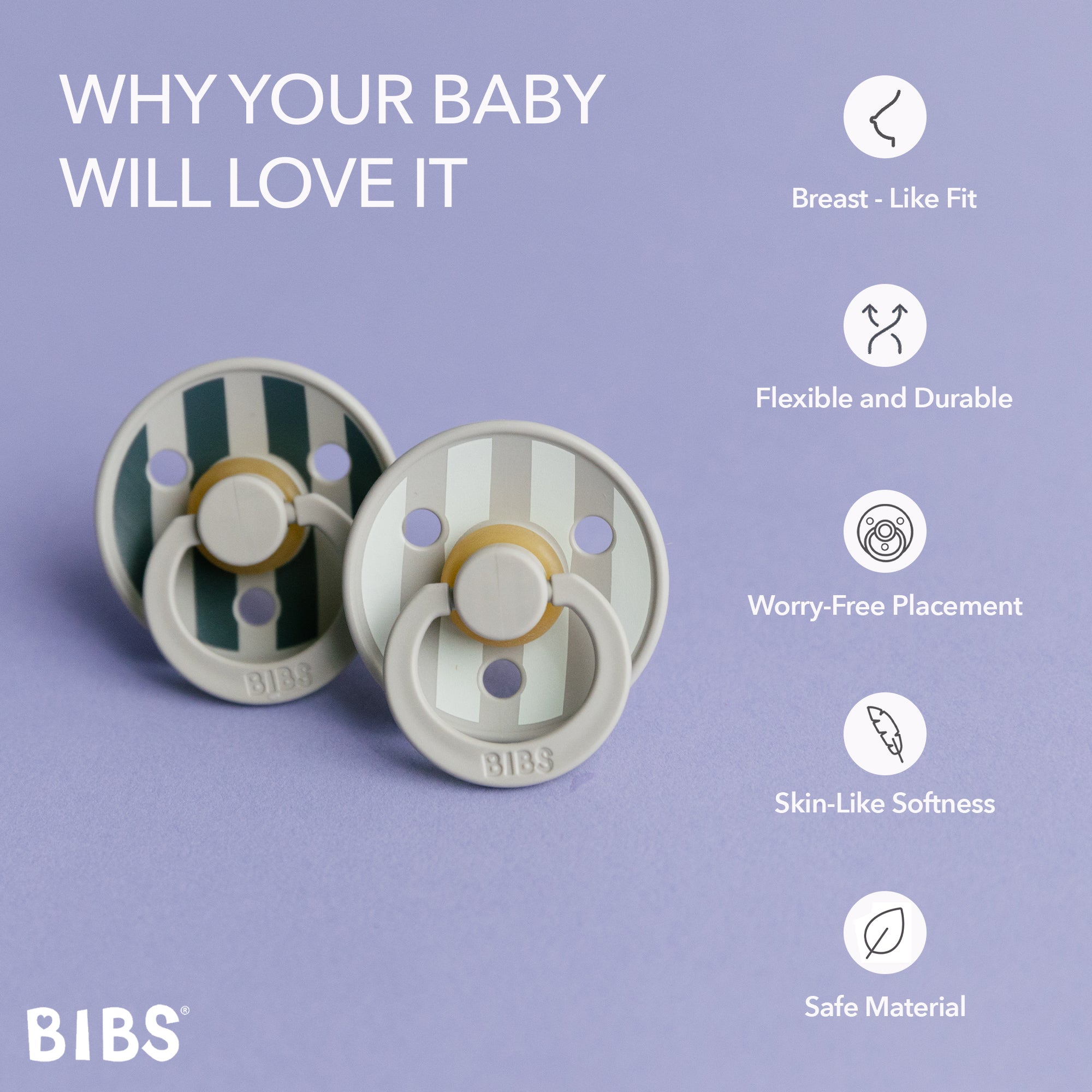Soothe naturally! The BIBS Round Pacifier Studio Colour 2 Pack features soft natural latex cherry-shaped nipples that mimic breastfeeding. BIBS designed these lightweight pacifiers with a shield for vital airflow. This BIBS set provides comfort for newborns and infants. A thoughtful gift for new parents.
