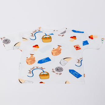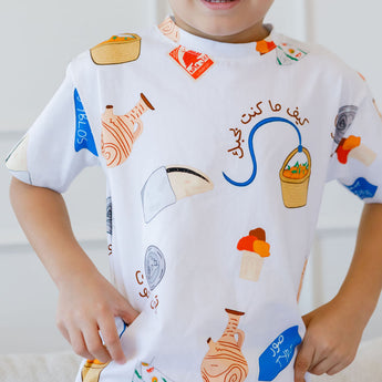 The Lebanon T-shirt is inspired by the vibrant culture of Lebanon, featuring a playful pattern with elements like Man2ouche, “Kif ma kent bhebak” lyrics, Bonjus, and Ice cream — celebrating iconic symbols of Lebanese life. Made from soft cotton, this T-shirt combines comfort and style, making it a perfect addition to your child’s wardrobe.