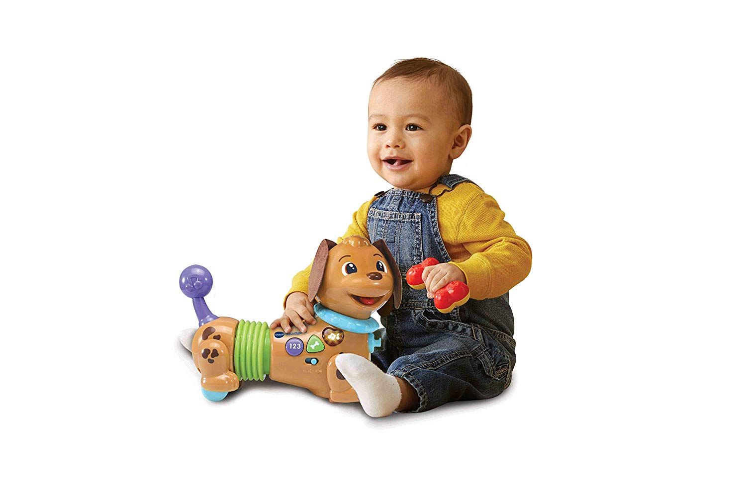 Introduce your little one to their new best friend, the VTech Walk & Wiggle Pup! This interactive baby toy is designed to entertain and educate infants aged 6 to 12 months. With its engaging lights, music, and playful puppy sounds, your child will delight in shaking the toy to see the pup's tricks. The soft fabric ears provide tactile stimulation, while the shape buttons introduce numbers, shapes, and fun phrases. Perfect for early learning and development, this toy is a must-have for any growing baby.