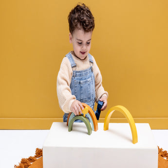 Wooden rainbow stacking puzzle for kids, ideal for little hands. Encourages creativity, motor skills and color recognition while offering safe, open-ended play. Made from FSC certified wood with non-toxic, child-safe paints for worry-free fun.