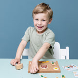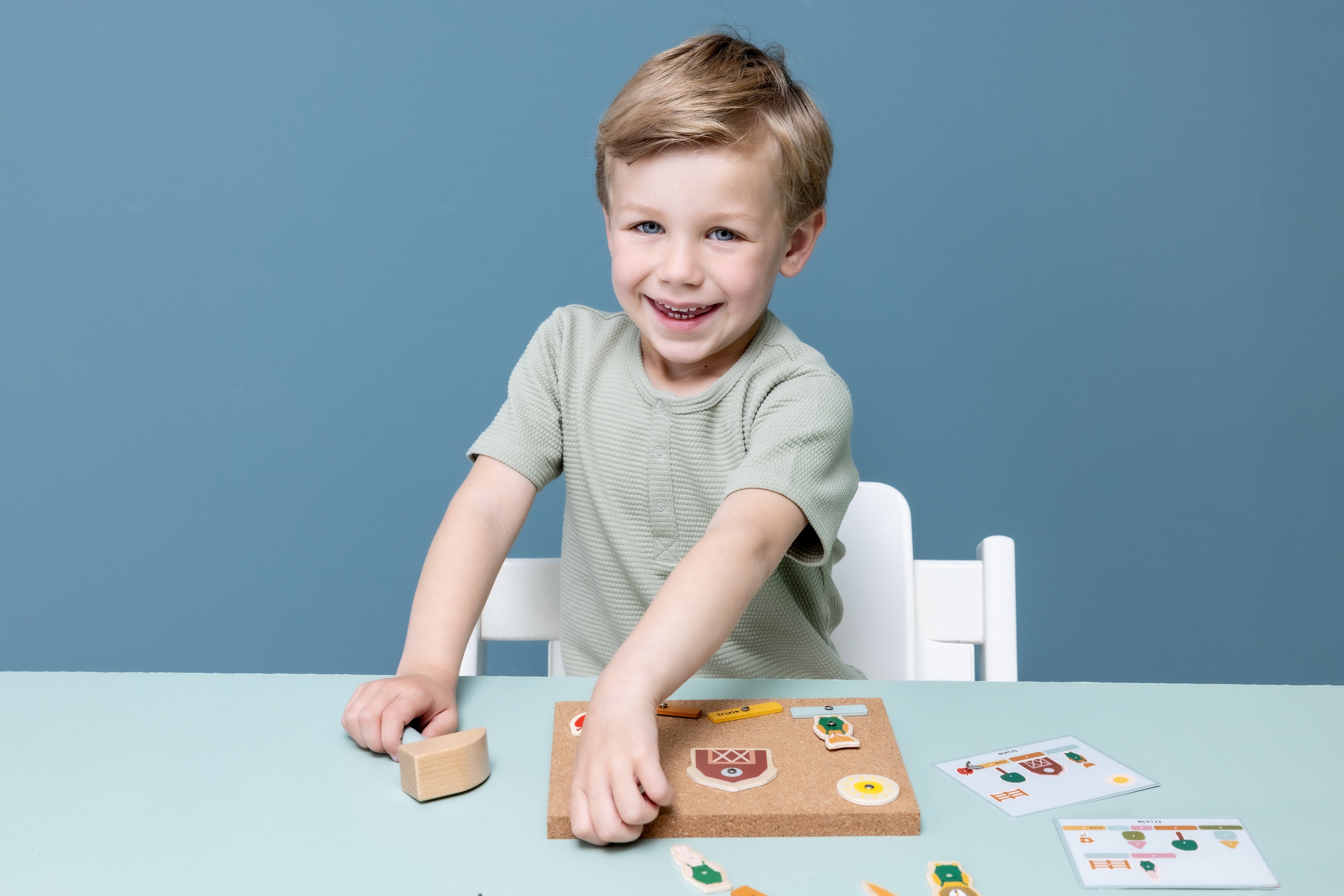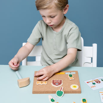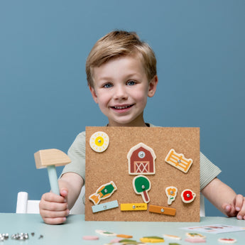 Tap tap tap - we're making a story! Create endless different farmyard scenes by "nailing" the tractor, barn, animals and more onto the cork board with this wooden hammer toy. Copy the scenes on the playing cards, or make up your own - perfect for sparking your little one's imagination and creativity, along with exercising fine motor skills. Made from 100% FSC® certified wood and non-toxic, child-safe paint.