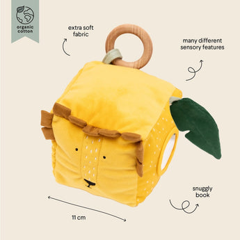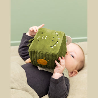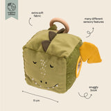Discover endless fun with the Activity Cube featuring Mrs. Rabbit, Mr. Dino, and Mr. Lion. This eco-friendly toy, crafted from organic cotton and recycled polyester, offers a sensory-rich experience with textures, crinkly sounds, and a built-in mirror. Perfect for little explorers aged 6 months and up, it includes a wooden and silicone ring for teething and carrying. Spot clean for easy maintenance. Encourage your child's development and imagination with this delightful companion.