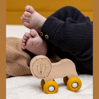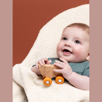 Your new favourite car toy is a friendly wooden animal on soft silicone wheels. Shaped for little hands to pick up and push along, its soft wheels are perfectly baby-safe, while the differing textures of the wood and the wheels are great for sensory exploration. Made with smooth, rounded edges, it’s the perfect friend to practice motor skills with, while fine-tuning baby’s hand-eye coordination.
