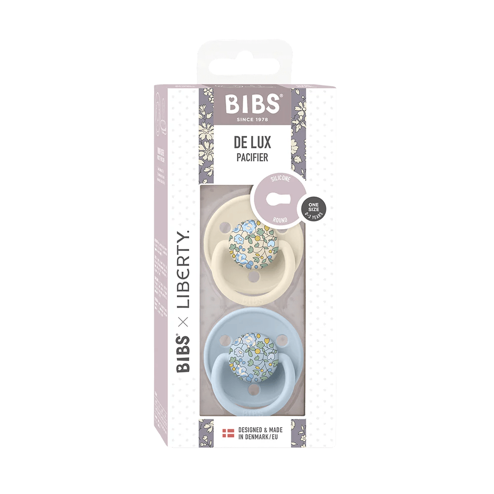 Premium soothing! The BIBS De Lux Silicone Pacifiers 2 Pack features cherry-shaped nipples in soft, medical-grade silicone. BIBS designed this matte-finish set for parents who prefer silicone over latex. This BIBS duo supports natural breastfeeding while offering a luxurious, modern look parents adore.