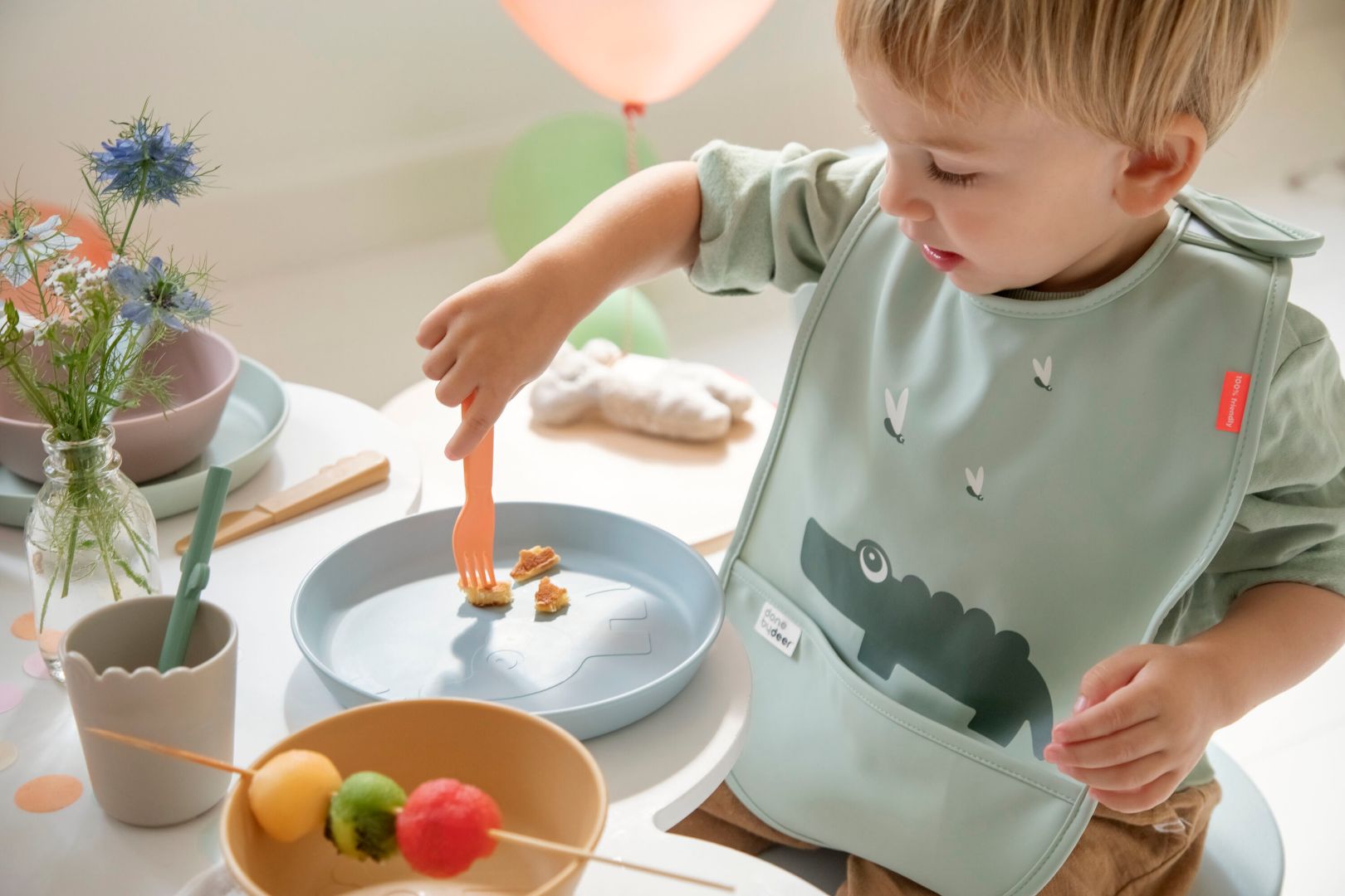 • Parents love: Quick Velcro bibs that go on in seconds and catch every mess