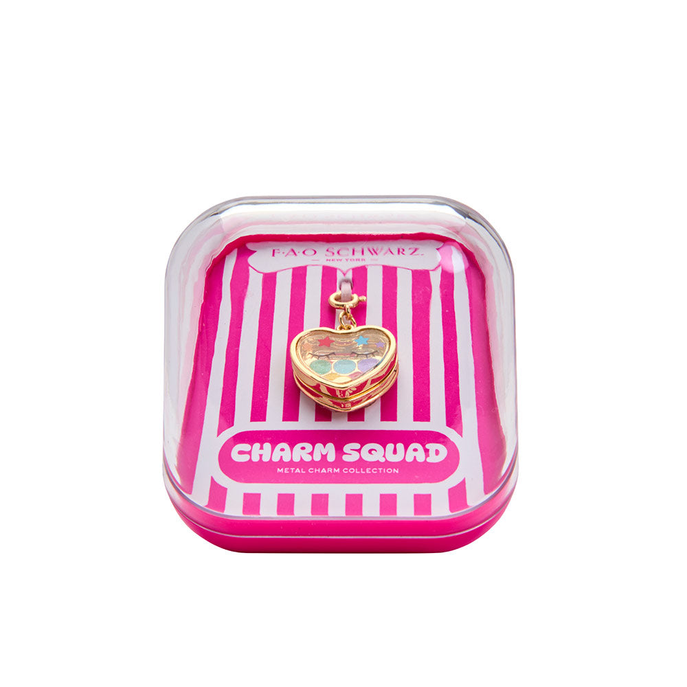 Get charm-ready with the FAO Schwarz® Charm Squad Eyeshadow Palette Charm. This heart-shaped compact opens to reveal colorful enamel shadows, a tiny makeup brush, and sparkly rhinestone stars that make every detail pop. Clip it onto your bracelet, necklace, or anywhere you accessorize to show off your love for all things glam. Whether you wear it closed or open for full effect, this charm brings beauty vibes to every stack.