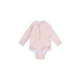 A long-sleeve rashguard swimsuit with UPF50+ sun protection for babies and girls, ideal for beach or pool days. Stretch fabric, chic prints, and ruffle details on select sizes help keep little swimmers comfy and ready for sun-soaked adventures.