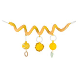 Soft activity spiral for babies, perfect for strollers, carriers, and playpens. Designed for newborns and up, it features detachable toys like a safe mirror, wooden ring, and crinkle paper for sensory fun. Organic materials, durable, easy to clean, and parent-friendly.