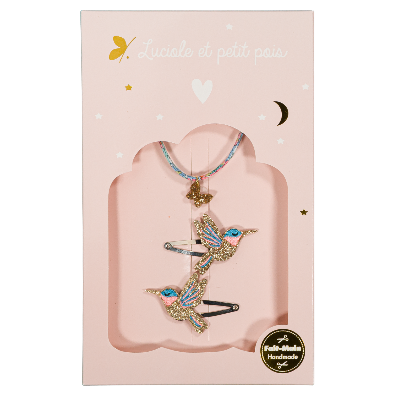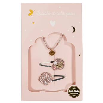 A curated gift box featuring stylish hair accessories and jewelry by Luciole Et Petit Pois. Designed for girls who love to accessorize, these multicolor sets offer a coordinated look, making them the perfect ready-to-give present for any special occasion.