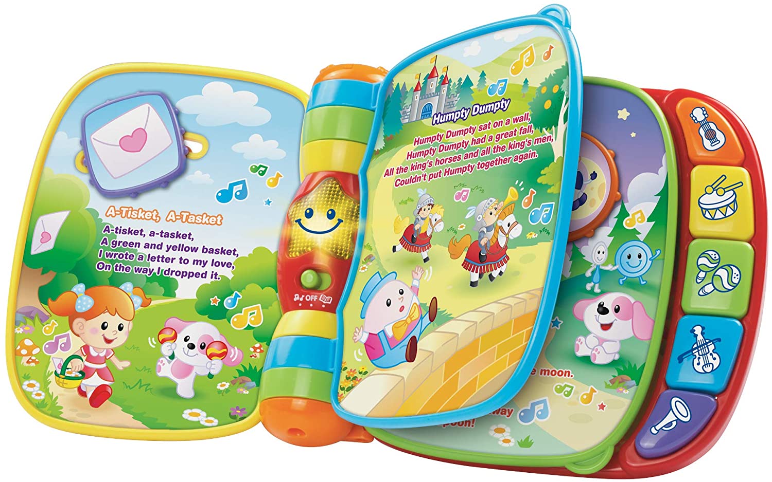 Interactive musical rhymes book comes to life with press piano keys that teach instrument names, sounds and colours. Includes two modes of play. Melodies of the nursery rhyme play if the instrument pressed is featured on the page of the nursery rhyme. 6 pages of bright and colourful nursery rhymes including Hey Diddle Diddle, Humpty Dumpty, Hickory Dickory Dock, Little Miss Muffet, The Mulberry Bush and Old MacDonald. Features slide and push manipulative buttons to encourage manual dexterity and discovery. Helps develop early language and reading skills. Durable plastic pages are wipe clean and non-rip so baby can play again and again.