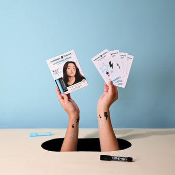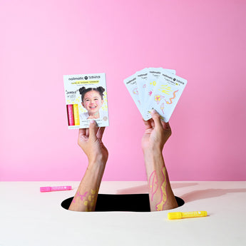 Fun temporary tattoo pen set for kids: 2 gentle, easy-to-use pens with template cards to spark creativity. Perfect for little ones, safe for skin, washable, and ideal for parties, gifts, or imaginative play.