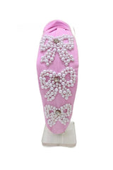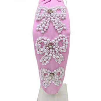 Padded fabric headband featuring pearl-effect bow embellishments.