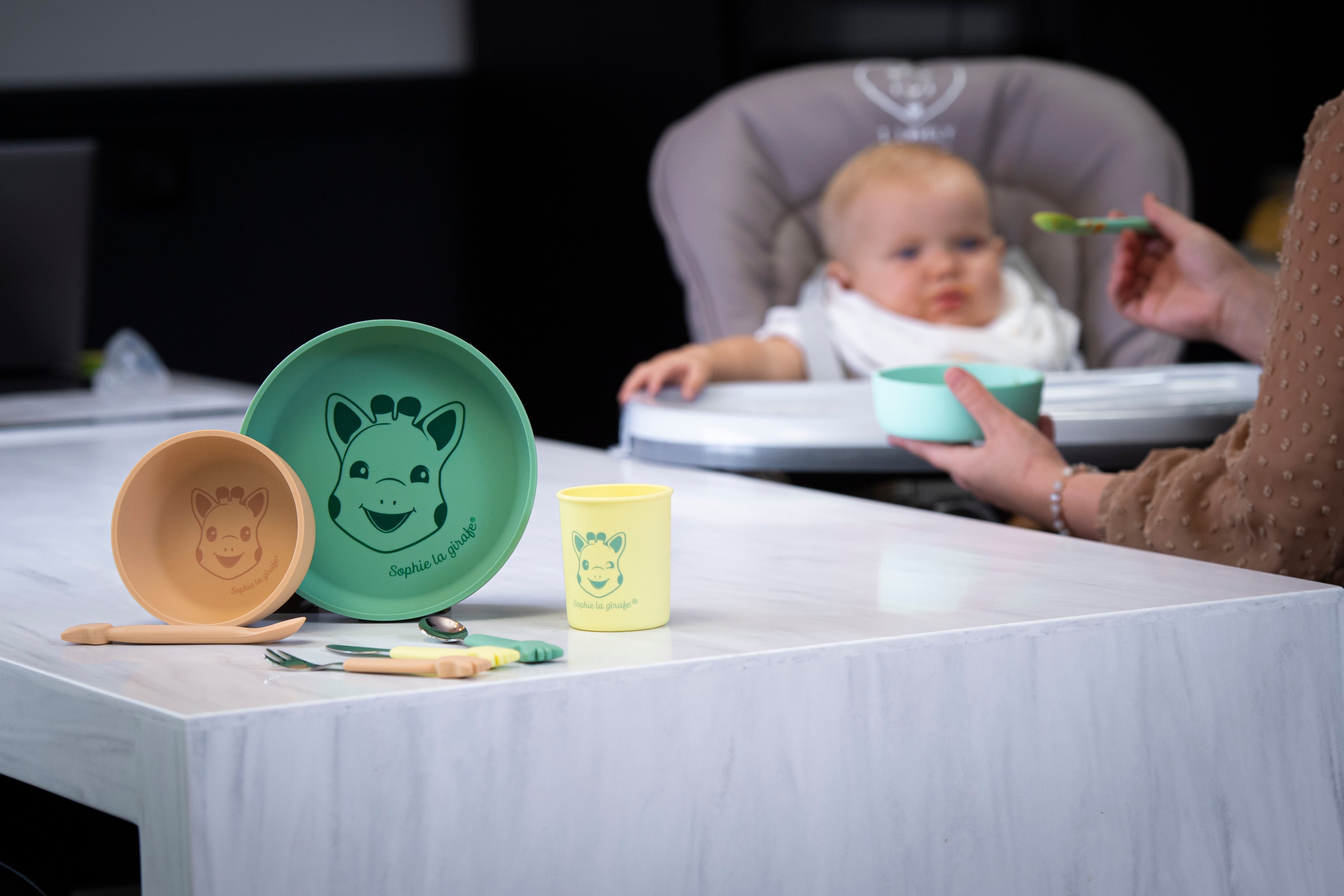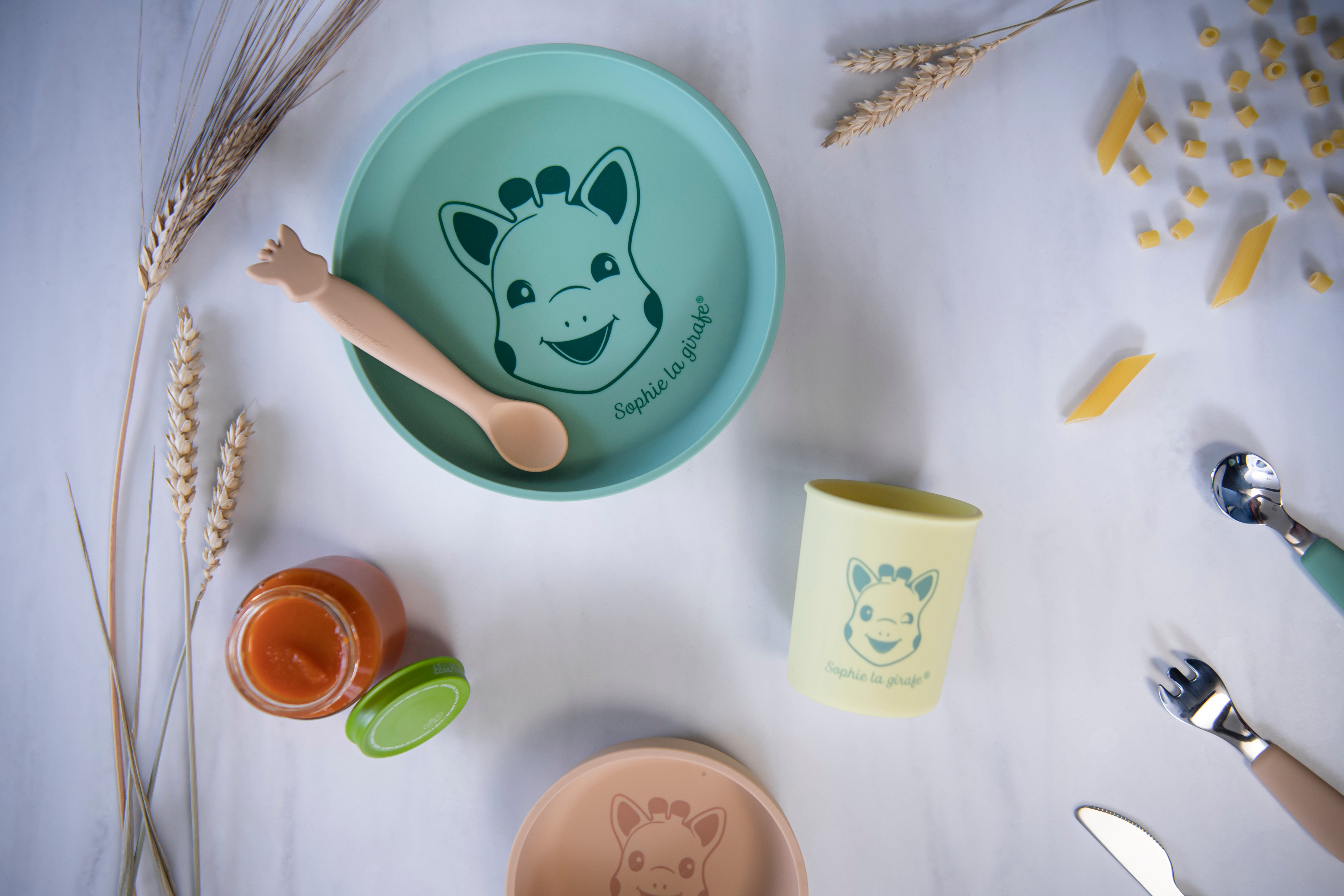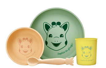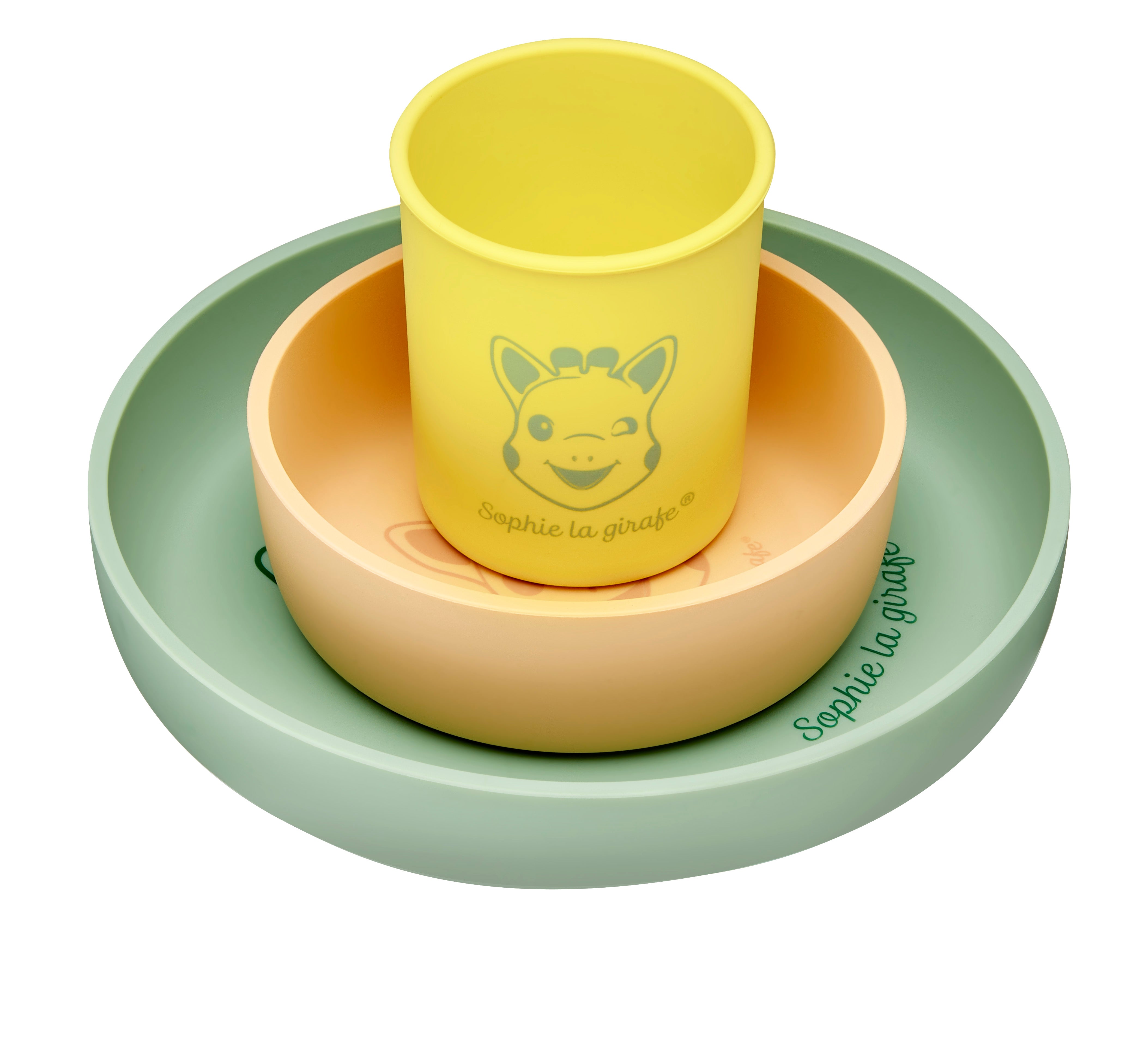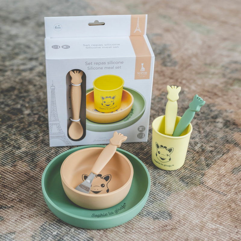 Mealtime with Sophie! The Sophie La Girafe 4 Piece Silicone Meal Set from the Il Etait Une Fois collection offers a complete feeding solution. Sophie La Girafe designed this BPA-free set for babies starting solids. This Sophie La Girafe set makes mealtimes fun, safe and organized with four coordinated pieces.