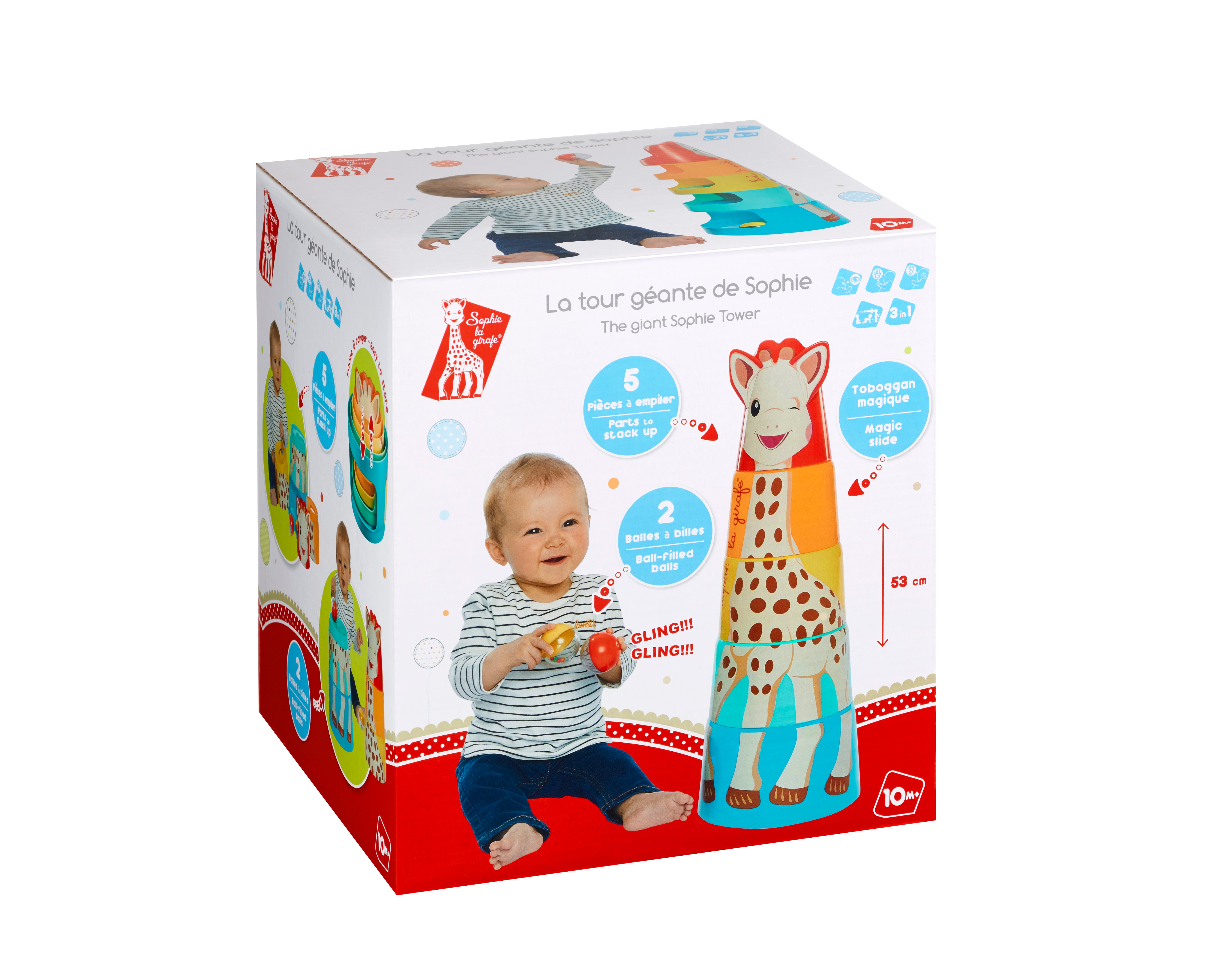 Stack, slide, play! The Sophie La Girafe Giant Tower 3 In 1 Toy combines stacking, puzzle and ball slide activities. Sophie La Girafe designed this Fresh Touch multi-activity toy for developing toddlers. This Sophie La Girafe tower builds problem-solving skills, coordination and creativity through three engaging play modes.