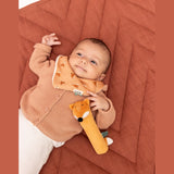 Soft squeaker toy made from organic cotton and recycled polyester, perfect for little hands and young children. Fun, safe and easy to use, it squeaks to encourage sensory play, interaction and cuddling. Eco-friendly and easy to care for.