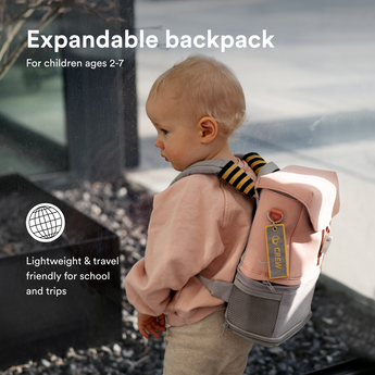 Expandable kids’ backpack for little travelers ages 2–7, perfect for school, trips, and family visits. Lightweight and travel friendly, with adjustable padded straps, reflective details, and water-repellent fabric that wipes clean easily.