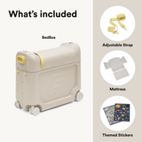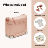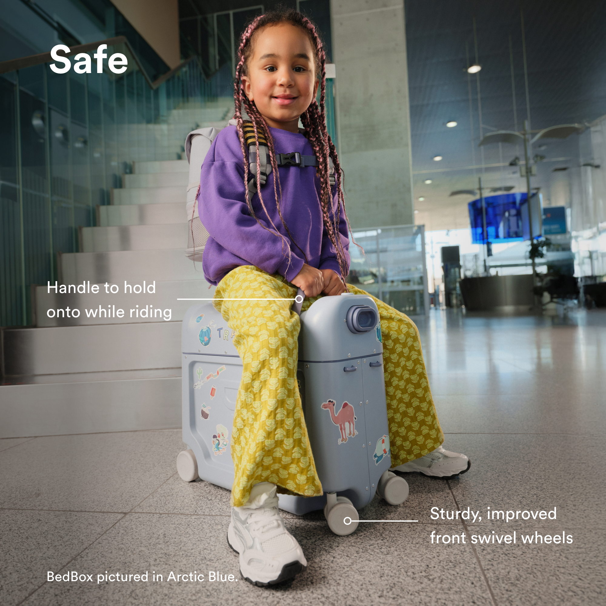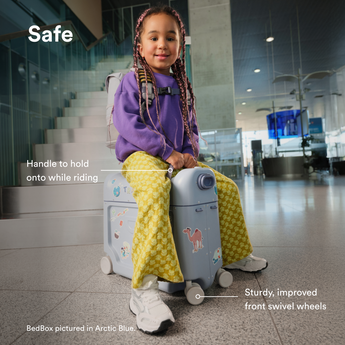 Premium ride-on suitcase that transforms an economy seat into a cosy bed for children 3–7 years. Perfect for flights, trains and ferries, it offers spacious storage, smooth-rolling wheels and a comfy mattress for more restful, stress-free family travel.