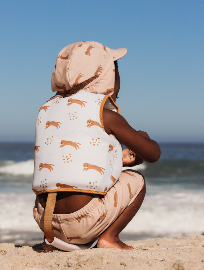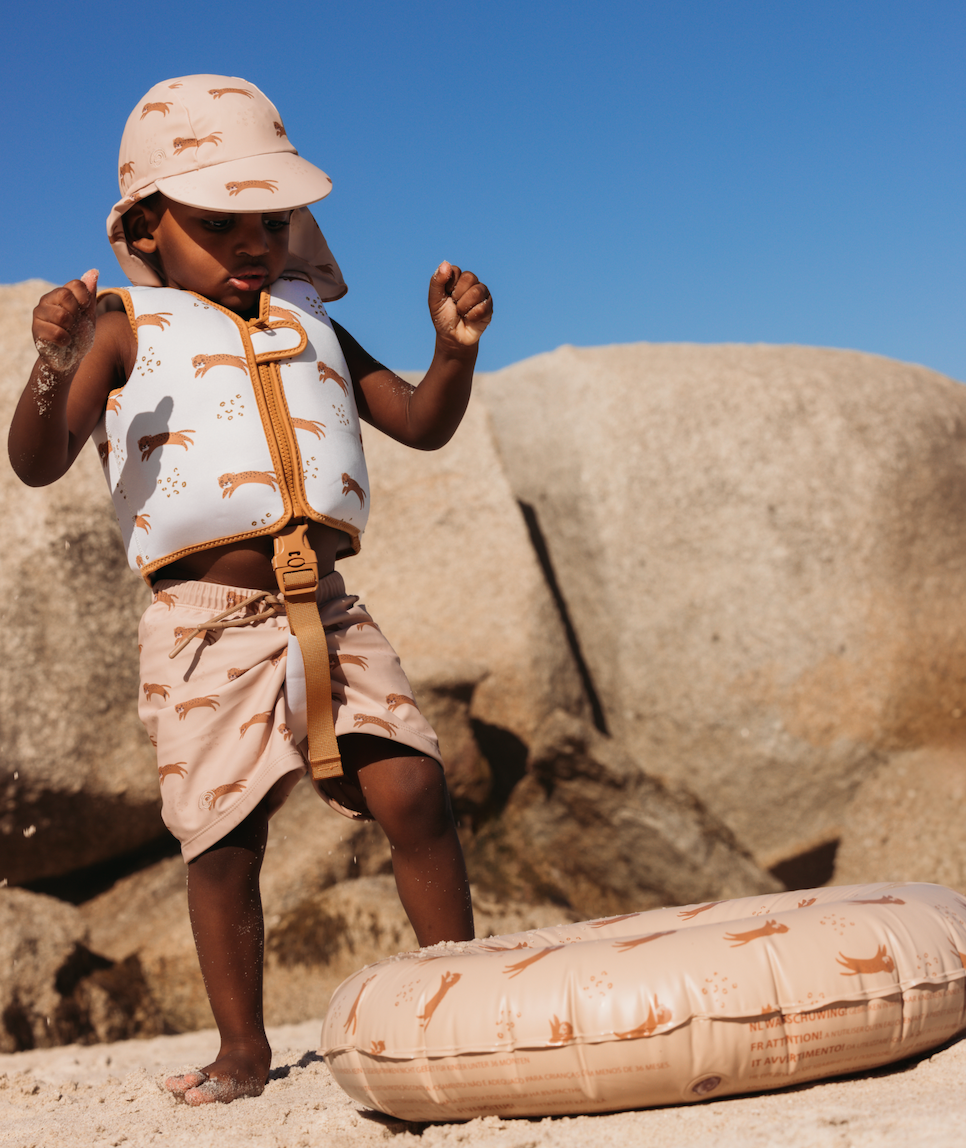 Sun swim hat for babies, toddlers, and young children—perfect for parents and caregivers on beach or pool days. UPF 50+ fabric helps protect sensitive skin, with quick-drying, lightweight, breathable stretch material for comfy coverage of eyes, neck, and ears.