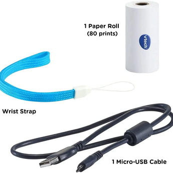 Click and print instantly with the KidiZoom® PrintCam™. Preview photos with the 2.4" color screen and print regular or panoramic photos in black and white. Flip up the lens to take selfies! The included paper roll prints up to 80 images—that’s a pennies per print value! When the paper’s gone, get the KidiZoom® PrintCam™ Paper Refill Pack (sold separately) to get three paper rolls and two adhesive paper rolls to turn photos into stickers. Also works with most 2.2"Wx1.2"D thermal paper refills. Let your creativity loose and add stickers, filters and borders to any image or video. Turn photos into drawings you can color yourself. Browse 110+ templates and activities including small greeting cards, printable games and more. This kid-friendly camera takes videos, too! Backup your full-color photos and videos by transferring them to a computer using the included USB cable under adult supervision. Use the microSD card slot to increase storage up to 32GB with a memory card (not included). Three video games are included for playtime between photo shoots. Includes parent controls to set daily time and printing limits or turn off games. Intended for ages 4+ years. Non-removeable, rechargeable lithium-ion battery included. Recharge battery with included USB cable.